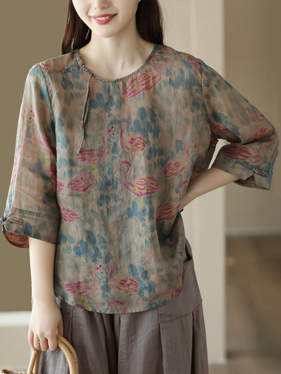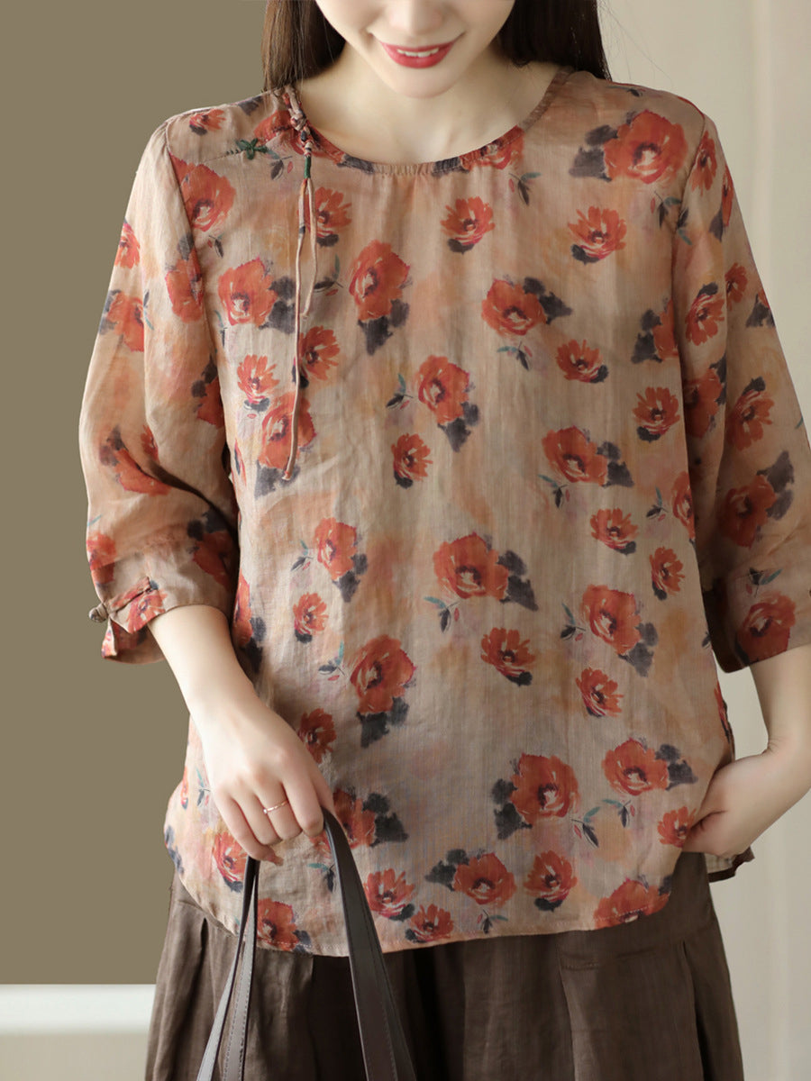 قميص نسائي صيفي عتيق من الكتان بطبعة ضفدع مزهر