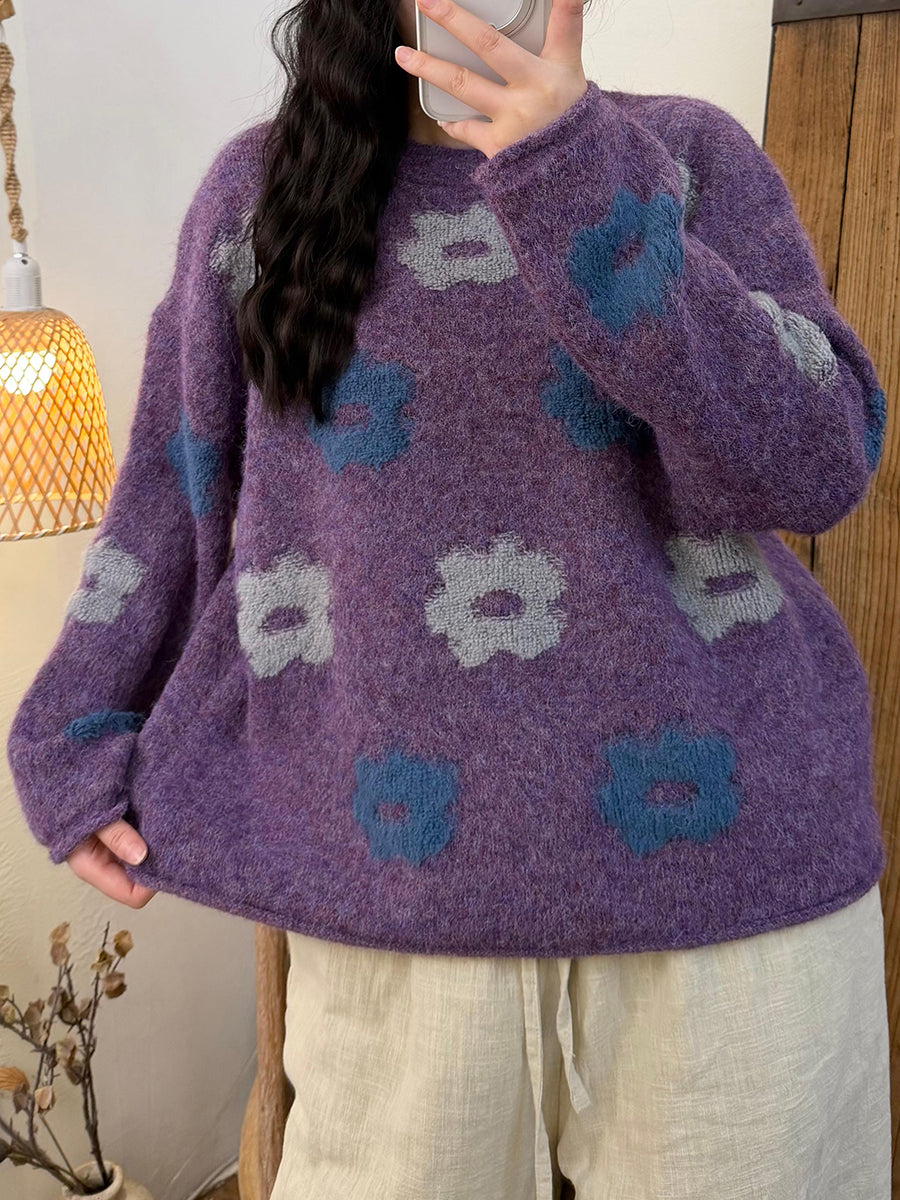 كنزة شتوية نسائية محبوكة بياقة دائرية مزينة بالزهور