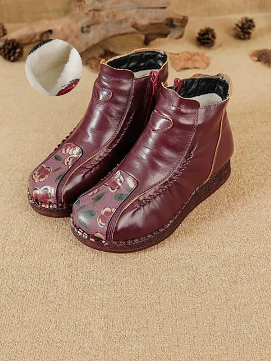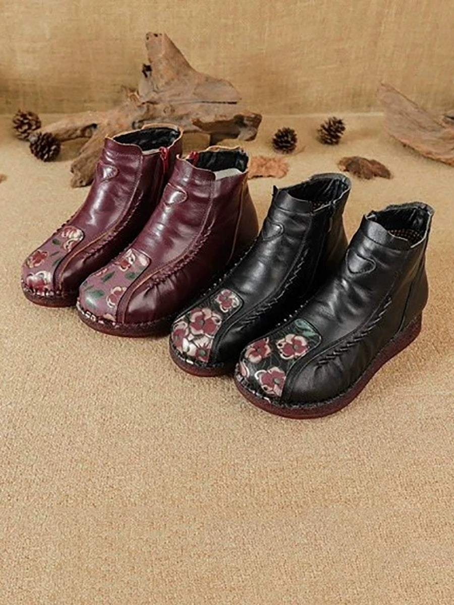 أحذية نسائية شتوية فنية من الجلد مزينة بالزهور تصل إلى الكاحل