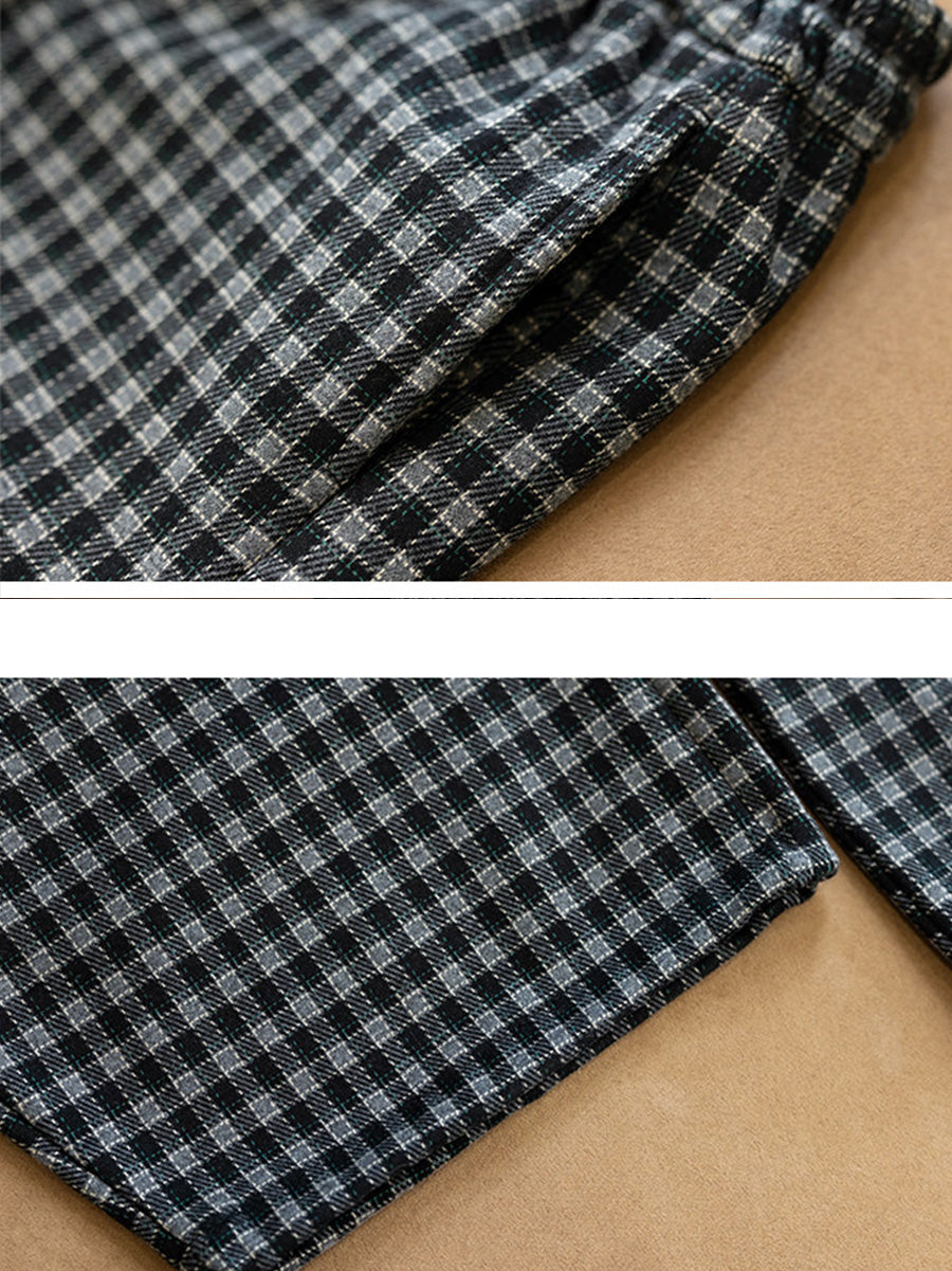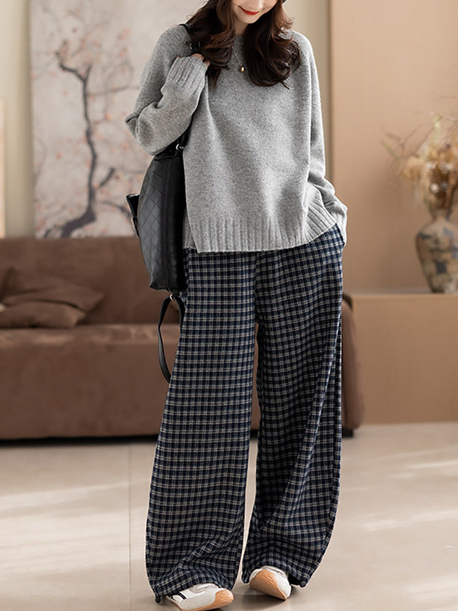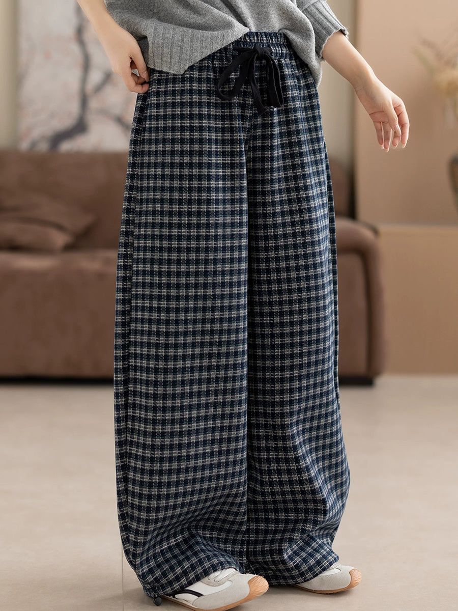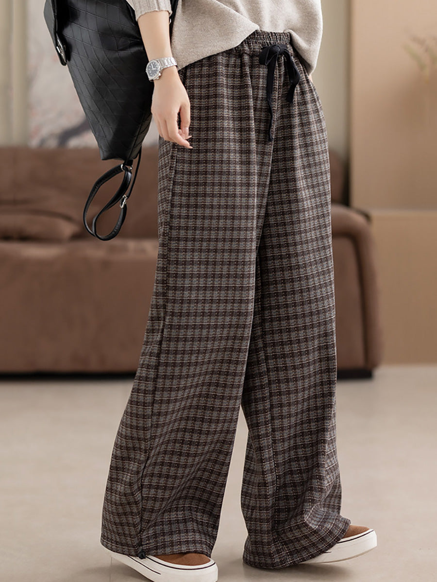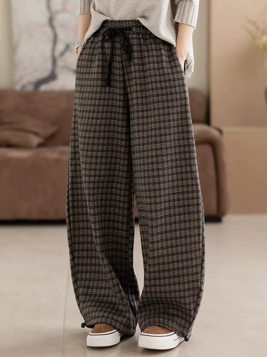 بنطلون نسائي شتوي كاجوال واسع الساقين بنقشة مربعات مبطن بالفرو