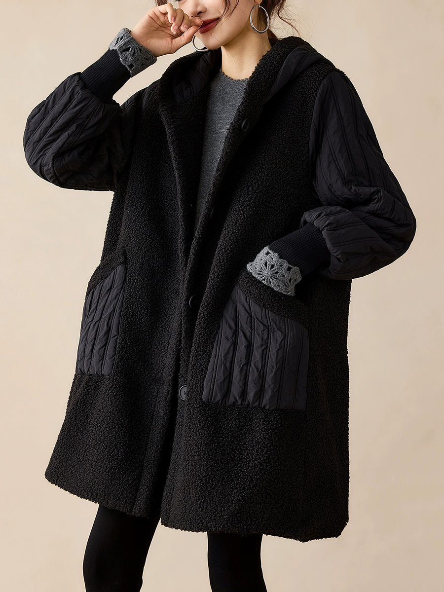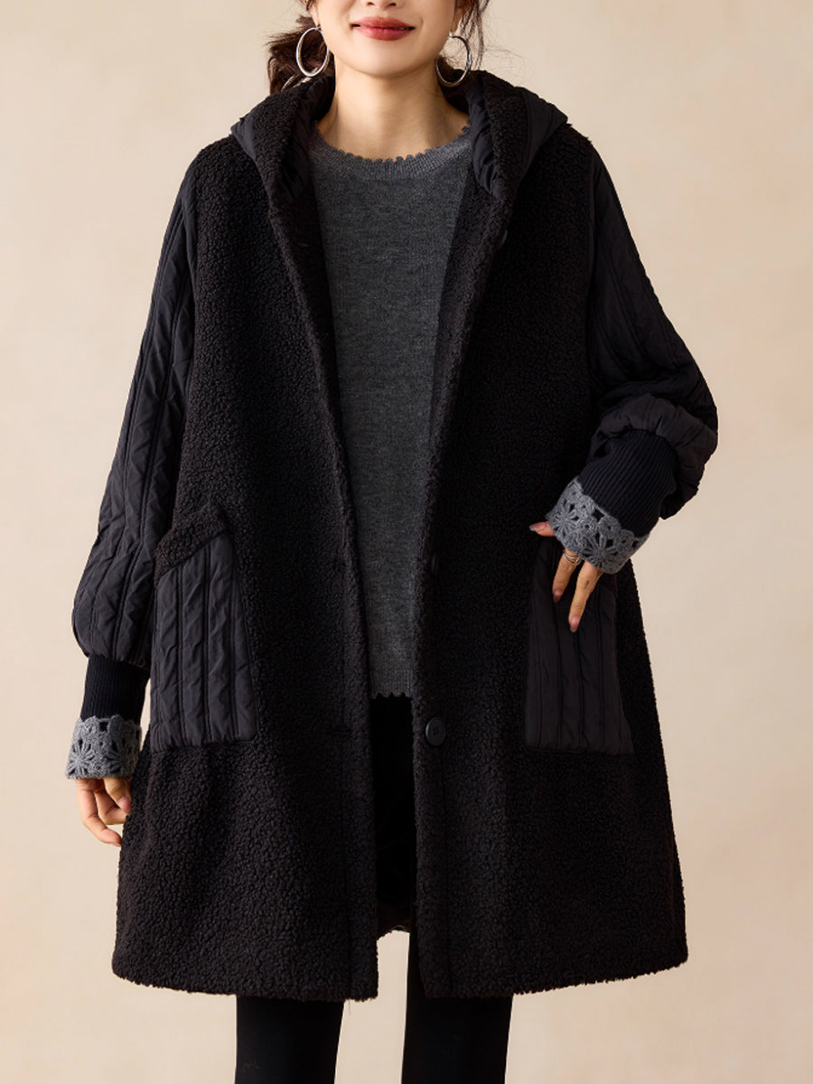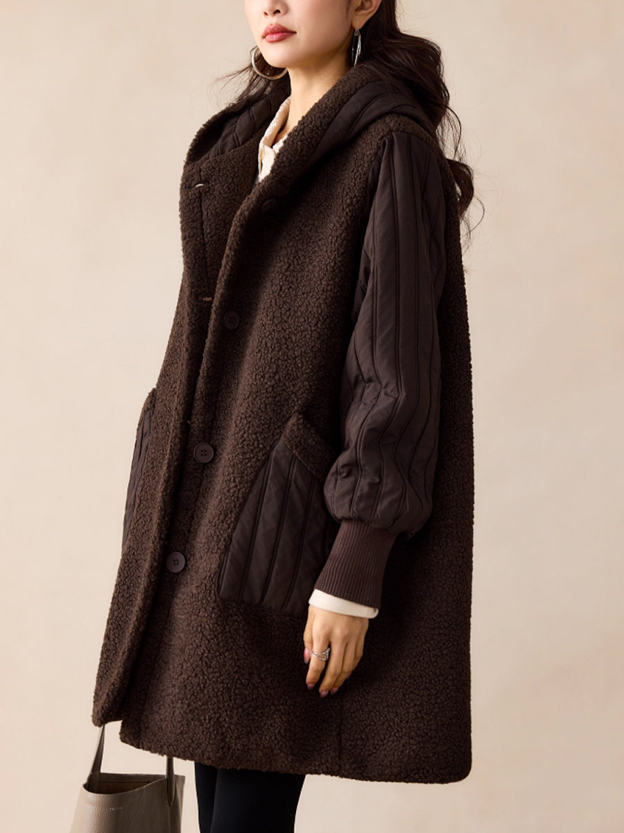 معطف نسائي شتوي كاجوال من الصوف بغطاء للرأس بلون نقي