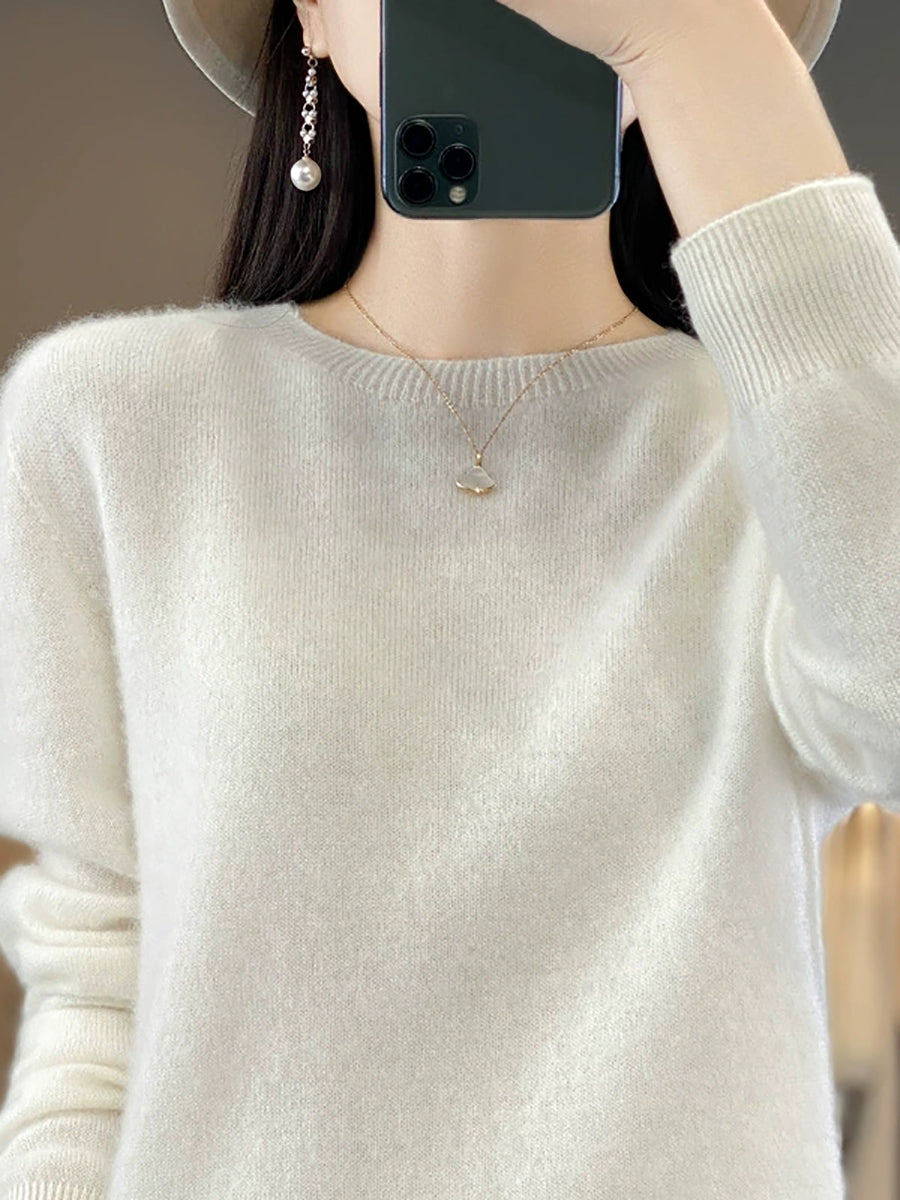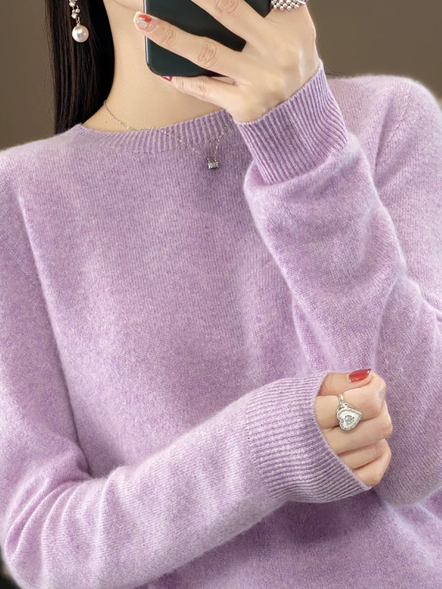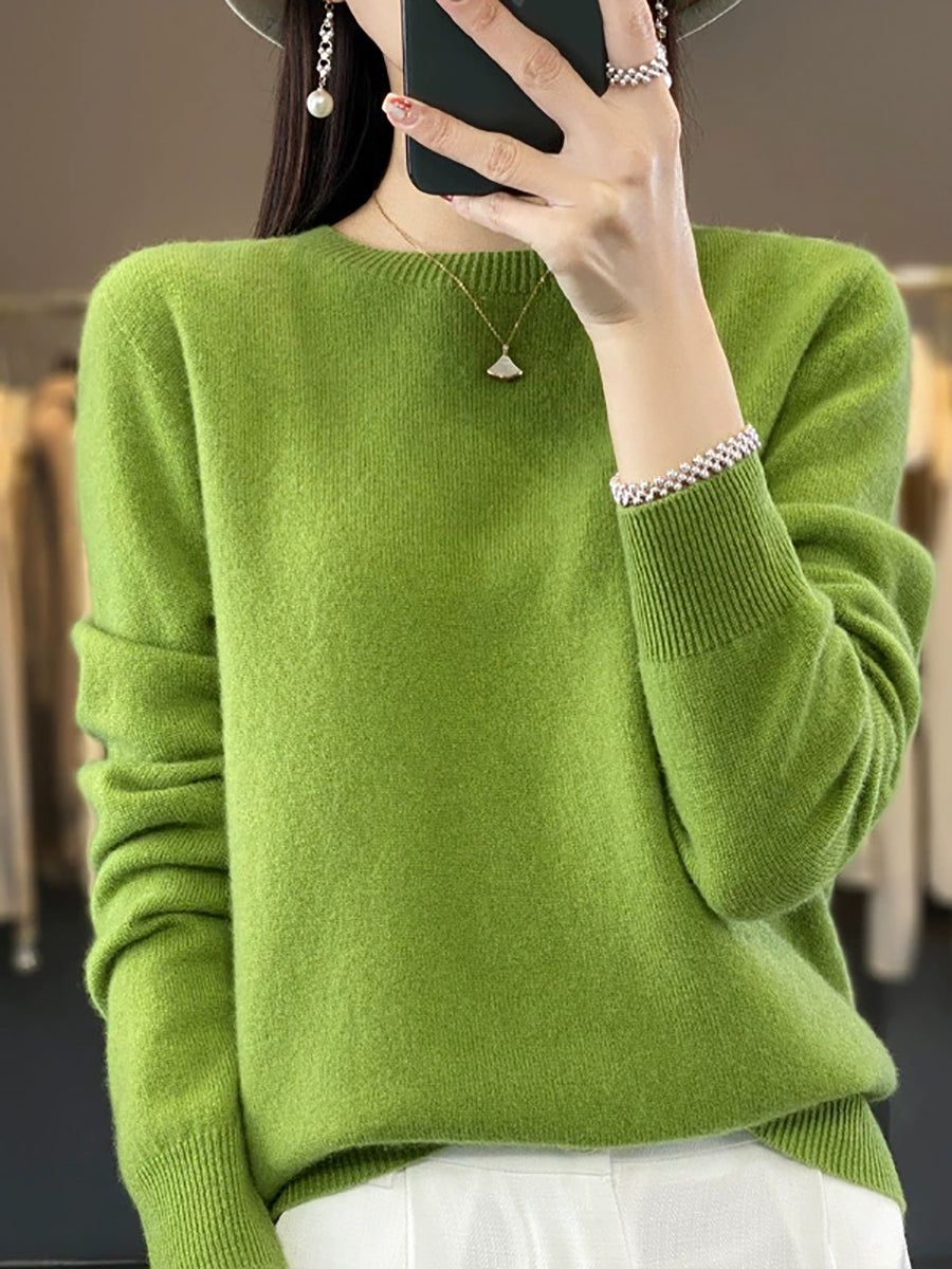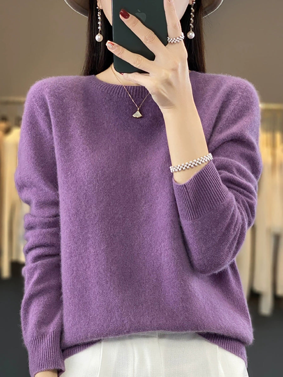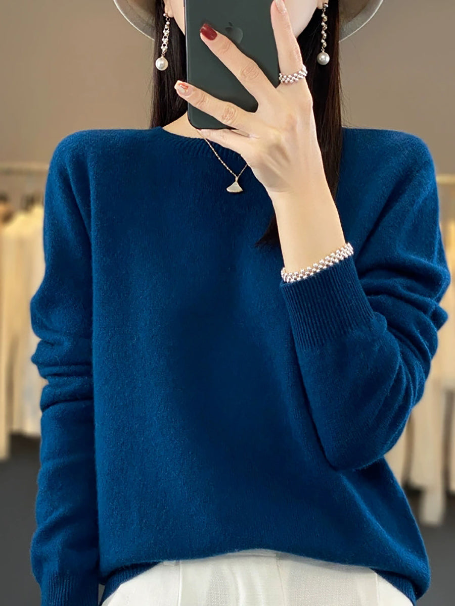 كنزة شتوية نسائية كاجوال بلون موحد برقبة دائرية محبوكة