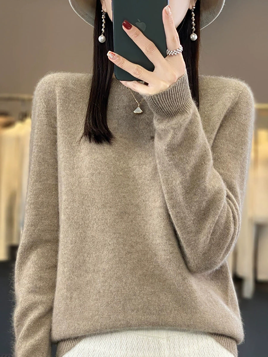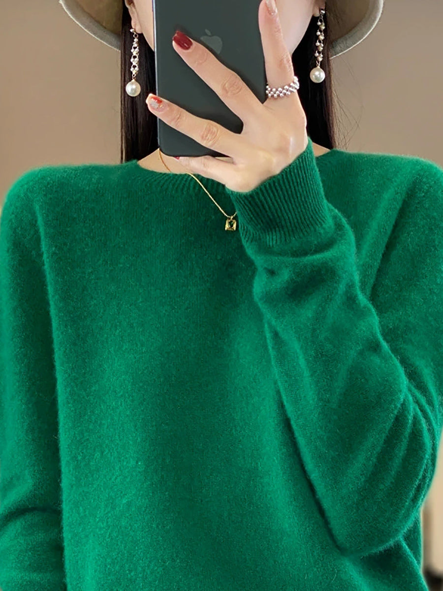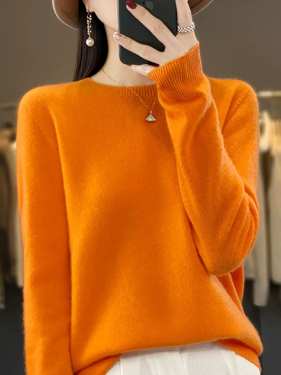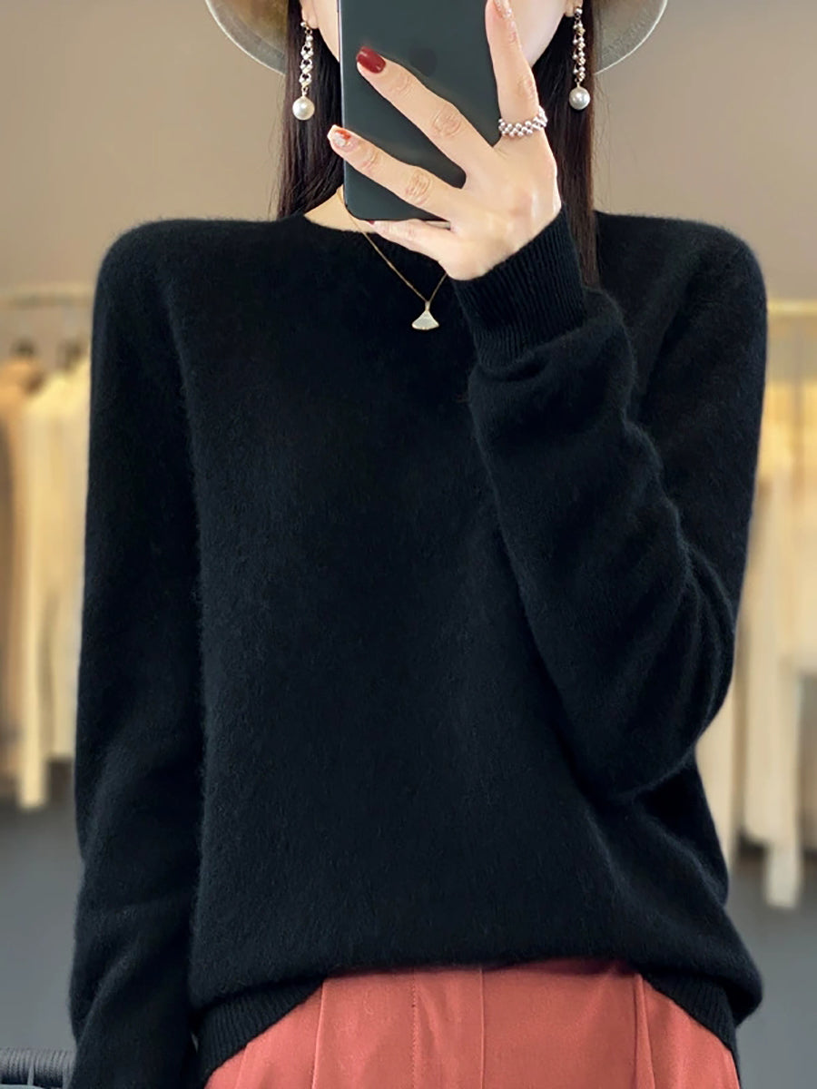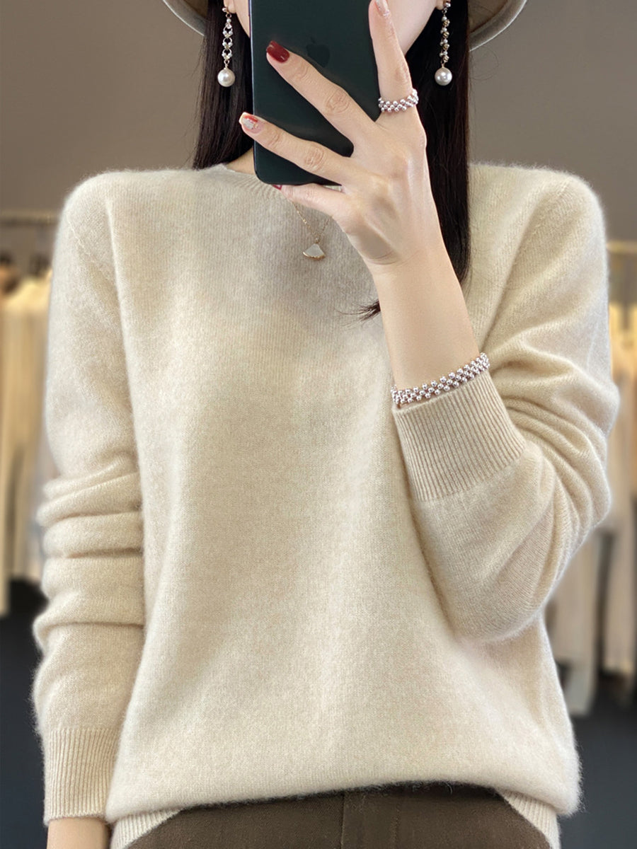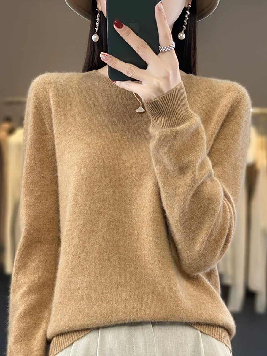 كنزة شتوية نسائية كاجوال بلون موحد برقبة دائرية محبوكة