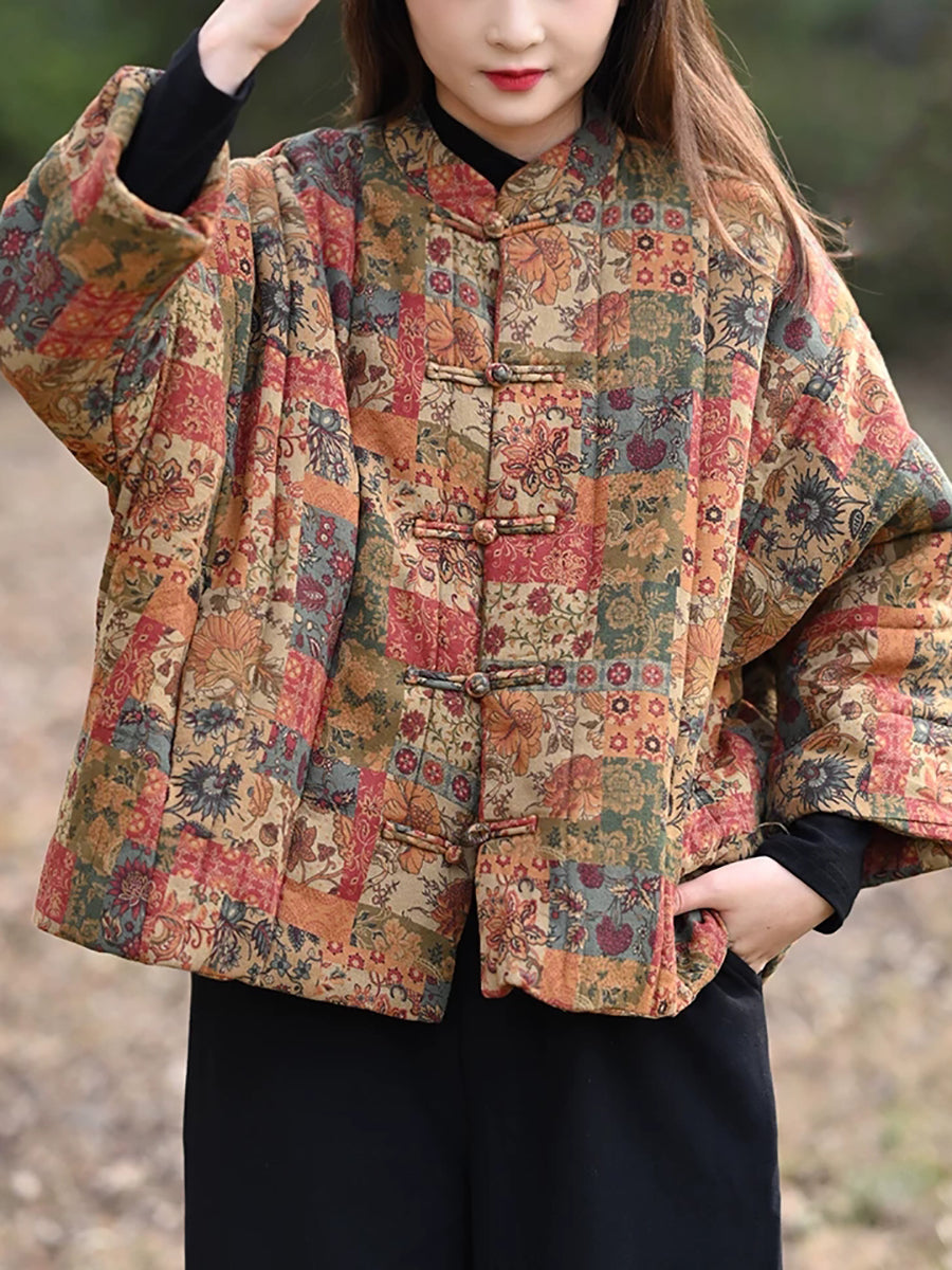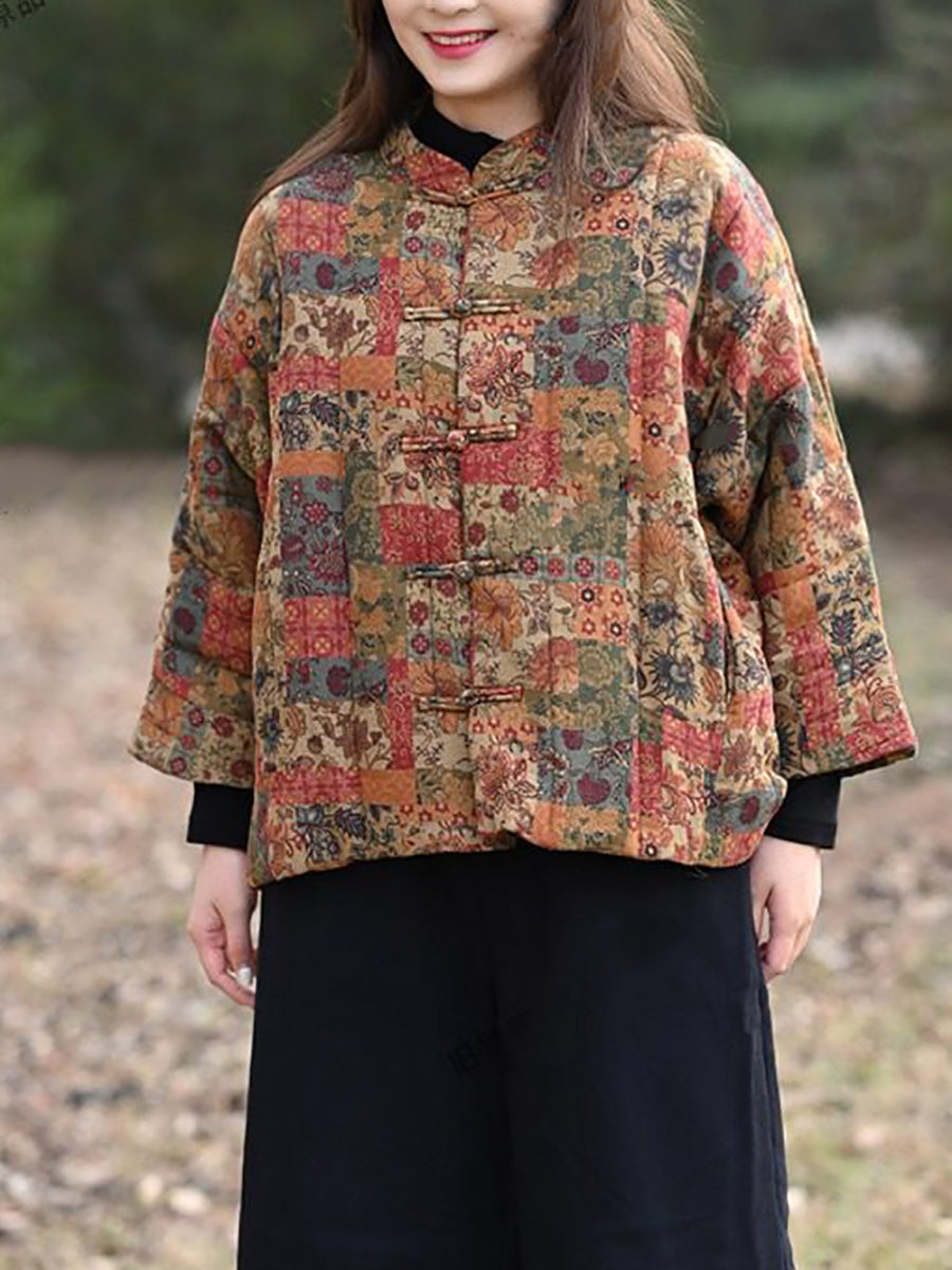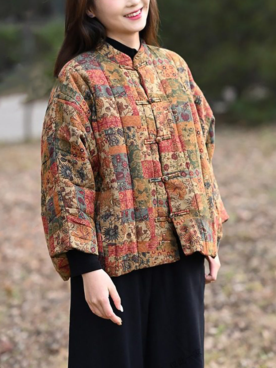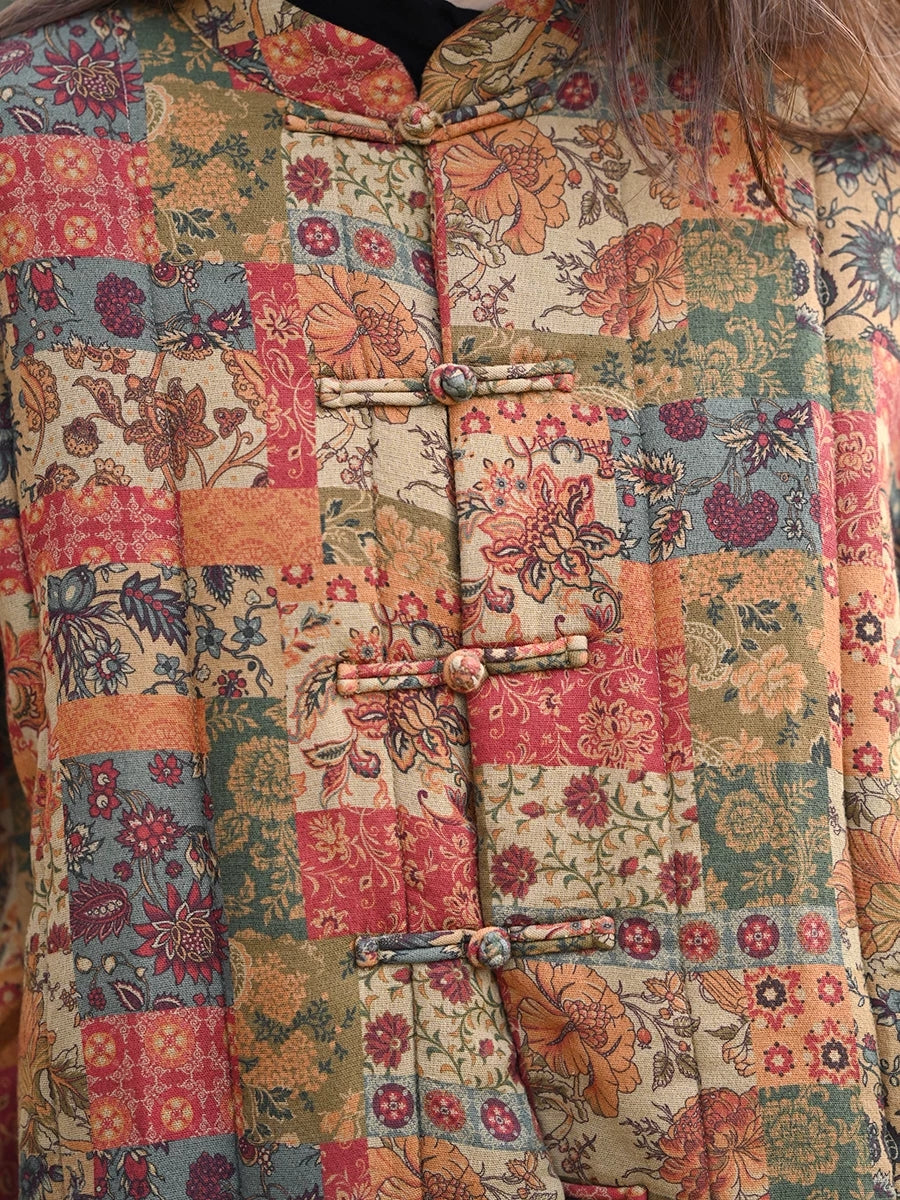 معطف شتوي مبطن للنساء بتصميم زهور مرقعة وياقة عالية