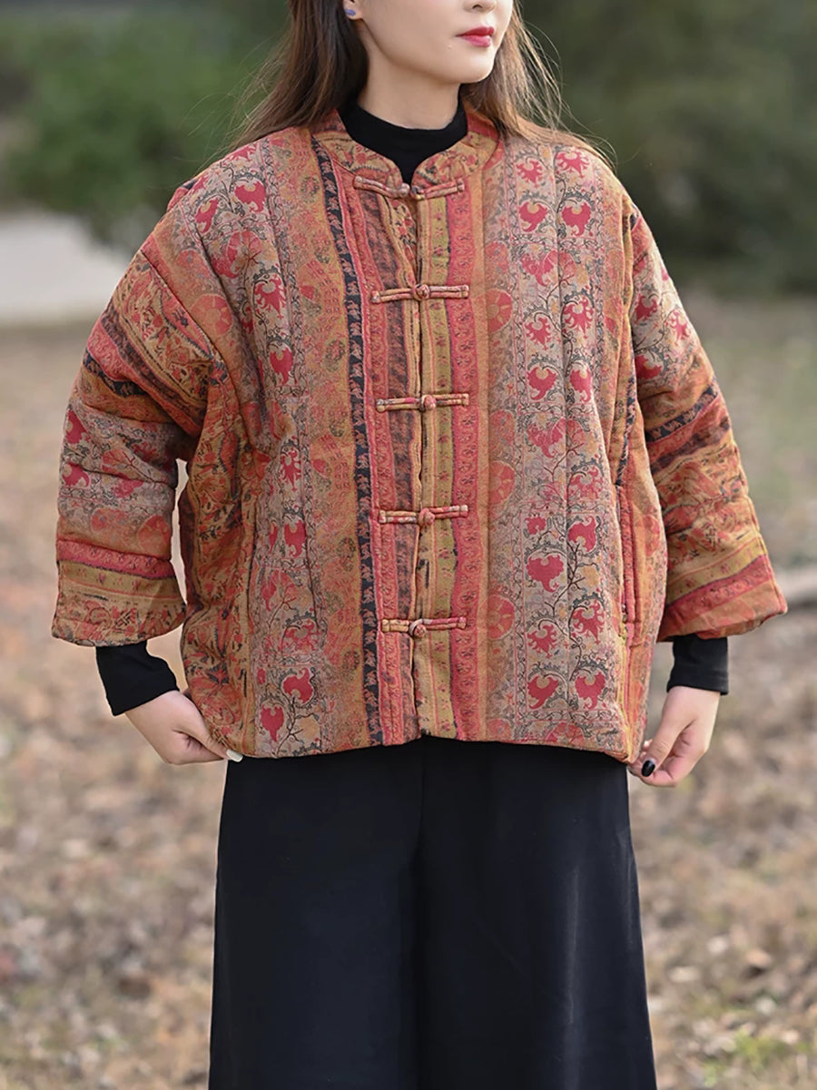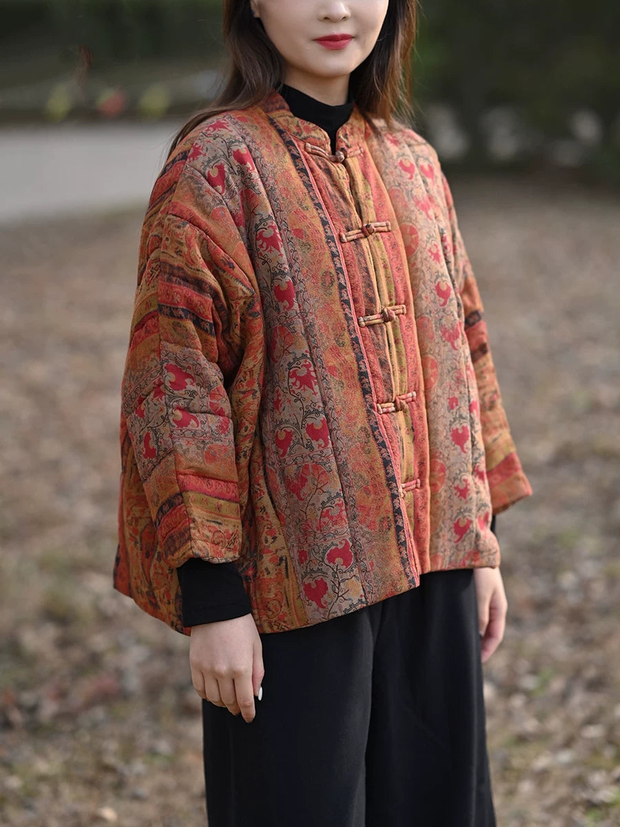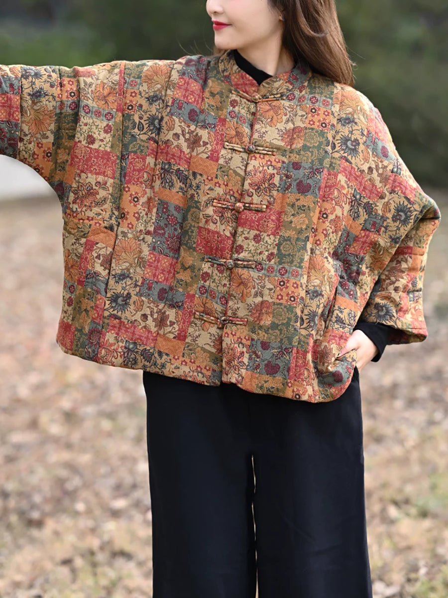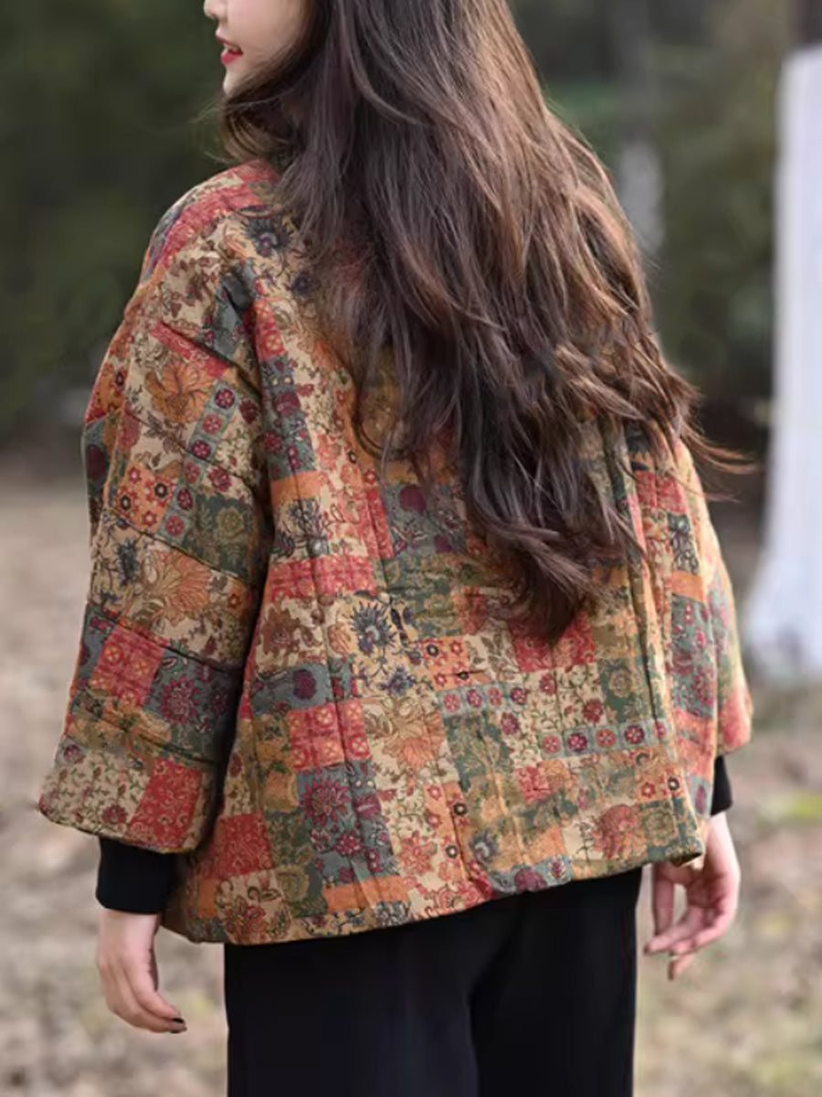 معطف شتوي مبطن للنساء بتصميم زهور مرقعة وياقة عالية